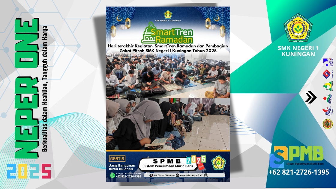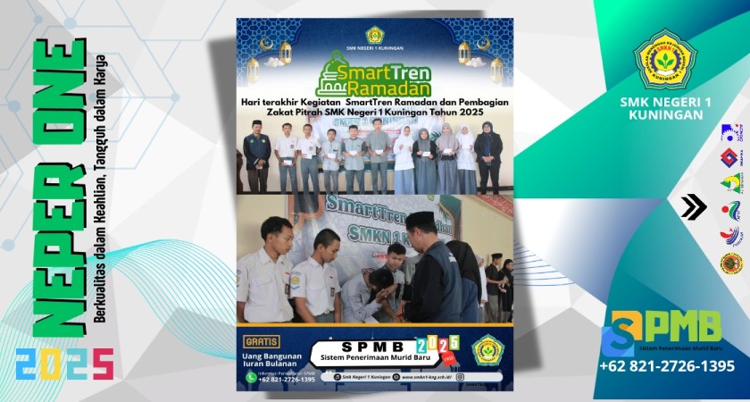 Pada kegiatan penutupan Smart Tren Ramadan SMK Negeri 1 Kuningan, acara ini diawali dengan sambutan dari pihak sekolah dan pengurus acara. Selama bulan Ramadan, program Smart Tren telah memberikan berbagai kegiatan yang mendidik dan bermanfaat bagi para siswa, seperti kajian agama, pelatihan keterampilan, dan kegiatan sosial. Acara penutupan ini juga diisi dengan refleksi tentang pentingnya meningkatkan kualitas diri dan keimanan, serta berbagi kebahagiaan dengan sesama. Sebagai bentuk kepedulian sosial, acara ini ditutup dengan pembagian zakat fitrah kepada Siswa yang membutuhkan, yang merupakan wujud dari semangat berbagi dan kepedulian di bulan suci Ramadan. Kegiatan ini menjadi momen yang penuh makna dan diharapkan dapat memberikan manfaat bagi seluruh peserta didik .